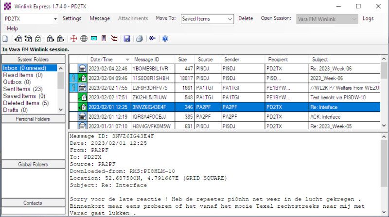 WinLink is the program to exchange emails via VHF using VARA FM or VARA HF (HF)